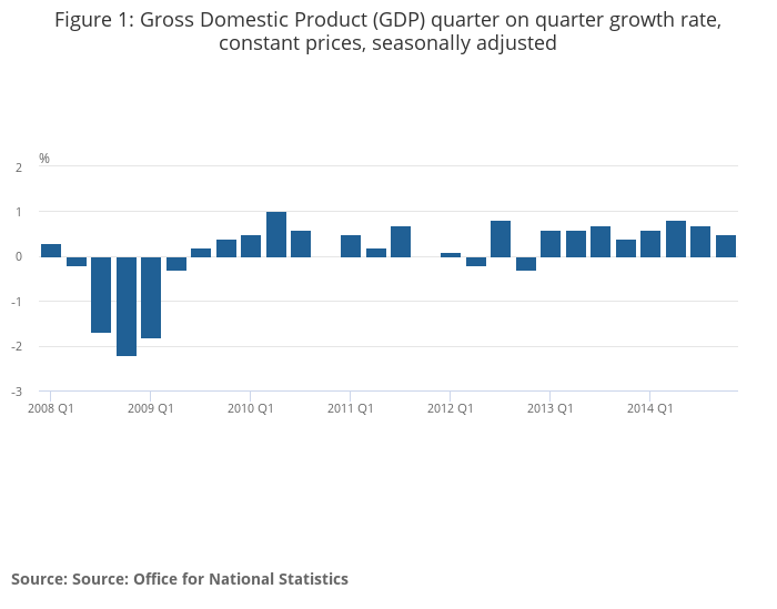 The preliminary estimate of Gross Domestic Product (GDP) indicated that the UK economy grew by 0.5% in Q4 2014, slightly slower than in Q2 and Q3. Growth of 2.6% in 2014 was the strongest calendar year figure since 2007.