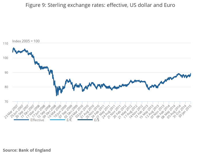 Image .csv .xlsThe fall in the oil price makes it challenging to assess the underlying degree of price pressure in the UK economy – a determination that is made more difficult by recent exchange rate developments. In principle, a stronger (weaker) value of sterling reduces (increases) the price of goods imported to the UK. However, the rate at which this impacts on consumer prices depends on both the import intensity of consumer demand and the degree of exchange rate ‘pass through’. This difficulty is compounded by recent changes in the value of sterling compared with the UK’s key trading partners. The effective sterling exchange rate was around 12% higher at the end of January 2015 than in March 2013 (Figure 9). However, this trade-weighted average reflects an appreciation against the euro of 14.4% and a slight depreciation against the US dollar – although this latter exchange rate has moved substantially during this period.