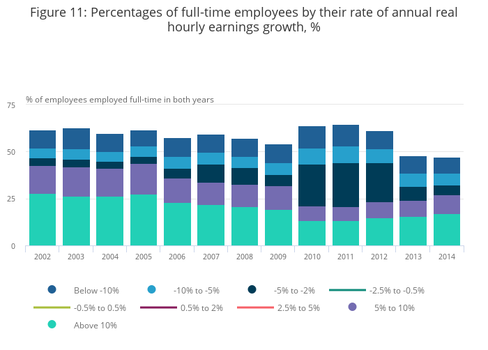 Figure 10: The distribution of real hourly earnings growth for full-time employees, 2002 to 2014