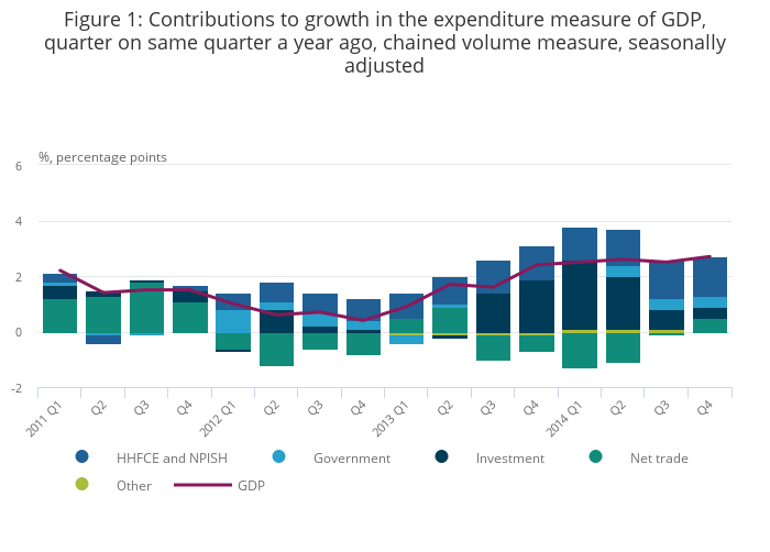 The second estimate of GDP also contained the first information on the expenditure components of GDP for the final quarter of 2014. Following recent trends, quarterly growth was largely driven by stronger household spending, which was 0.5% higher in the final three months of 2014 than in the previous quarter. Net trade also made a substantial contribution, as the volume of exports increased by 3.5% compared with slower growth of 1.3% in imports. Comparing Q4 2014 with the same period a year ago (Figure 1), household spending accounted for just over half of the growth of total expenditure, while net trade (19%), investment (15%) and government (15%) accounted for more modest proportions.