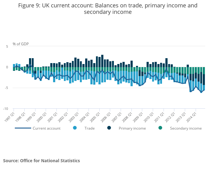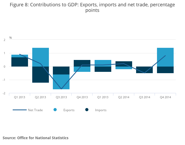 The UK’s current account deficit improved slightly in Q4 2014, driven by a stronger balance on trade. This improvement can be partly attributed to the recent fall in oil prices, but has also been driven by an increase in exports of manufactured goods.