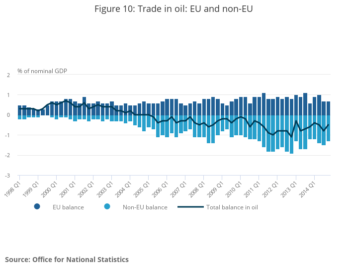 Image .csv .xlsAlthough relatively strong growth in exports – especially of manufactured goods – has helped to improve the overall trade balance, some of this improvement can also be attributed to the impact of the changing price of oil on the cost of UK imports. The UK has been a net importer of oil since 2004, when a rising deficit on oil with non-EU countries offset a stable, positive balance with the EU (Figure 10). As a consequence, while the fall in the oil price in the fourth quarter of 2014 reduced the value of UK exports, it reduced the value of UK imports to a greater degree.