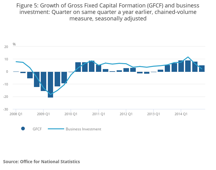 Download this chart Figure 5: Growth of Gross Fixed Capital Formation (GFCF) and business investment: Quarter on same quarter a year earlier, chained-volume measure, seasonally adjusted