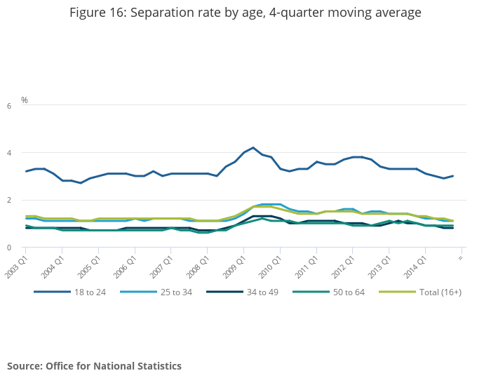 ONS analysis of “job to job” flows suggests improving labour market conditions. The rate of job to job moves continues to increase while the separation rate – the proportion of each age group who move from employment to unemployment each quarter – fell throughout 2014. This edition highlights how these conditions have differed across age groups.