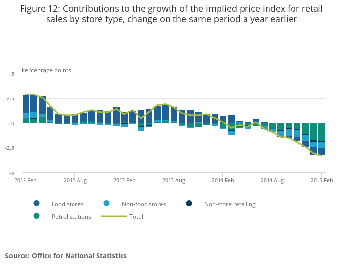 The annual rate of Consumer Prices Index (CPI) inflation fell to zero in the year to February 2015, while the prices of goods at retail outlets was 3.3% lower in February than in the same period a year ago. Although the lower cost of petrol accounted for around half of this latter fall, price falls were also observed in food stores, non-food stores and non-store retailing.