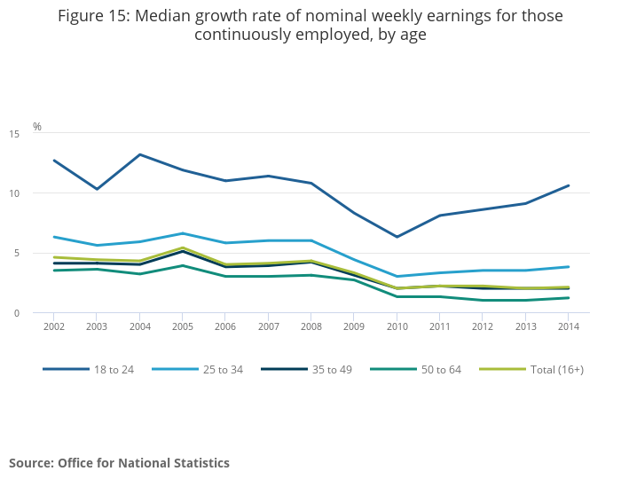 Figure 15: Median growth rate of nominal weekly earnings for those continuously employed, by age