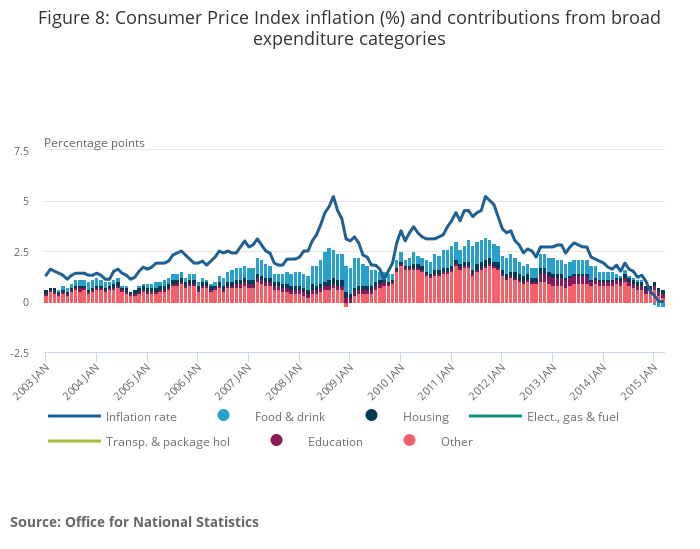 Despite continuing growth in the economy, the annual rate of consumer price inflation remained at a record low of 0.0% in March 2015. To assess the factors that have been driving low inflation, Figure 8 breaks down the annual rate of CPI inflation since 2003 into the contributions from six broad expenditure categories (detailed in the notes to Figure 8). This highlights how the recent drop in inflation has been led by falling prices for food and energy.