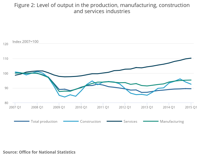 The economy grew by 0.3% in the first quarter of 2015, a little more slowly than on average over the past two years, largely due to the services sector where quarterly growth eased to 0.5%.