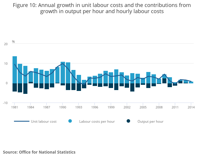 Figure 10: Annual growth in unit labour costs and the contributions from growth in output per hour and hourly labour costs