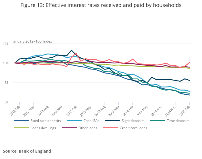 Image .csv .xlsAlthough the Bank of England Base Rate has remained unchanged since 2009, Figure 13 shows how the interest rates on various deposits (solid lines) and loans (dotted lines) have moved since 2012. While the rate of interest received on savings from deposits with financial institutions has declined since the beginning of 2013, the rate paid by households on loans has remained relatively stable. Savings rates in some cases have fallen by over a third since 2013.
