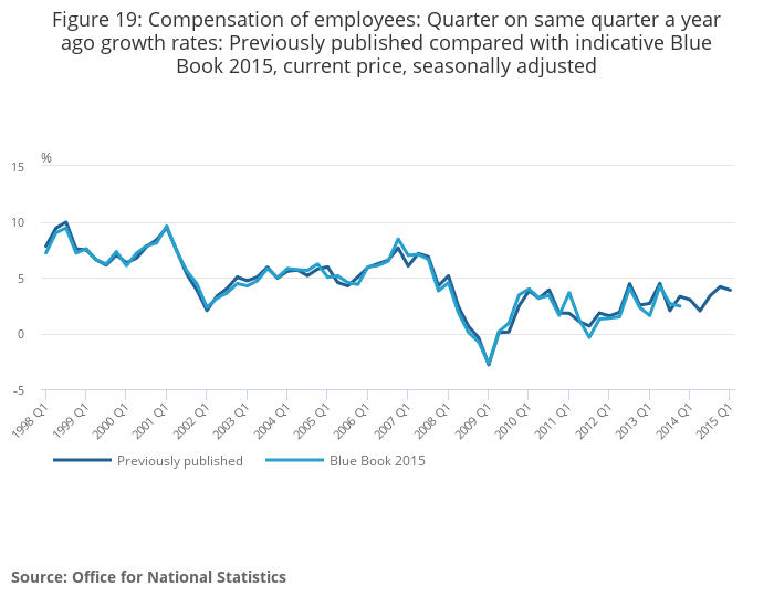 Download this chart Figure 19: Compensation of employees: Quarter on same quarter a year ago growth rates: Previously published compared with indicative Blue Book 2015, current price, seasonally adjusted
