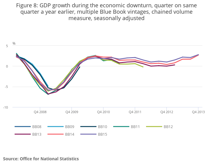 - Each line shows the estimates of quarter on same quarter a year earlier real GDP growth, published in the Quarterly National Accounts that was consistent with the respective Blue Book. For BB08 this was Q2 2008, for BB09 this was Q1 2009, for BB10 this was Q1 2010, for BB11 this was Q2 2011, for BB12 this was Q1 2012, for BB13 this was Q1 2013 and for BB14 this was Q2 2014.