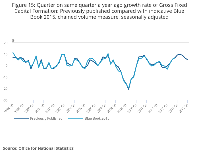 Download this chart Figure 15: Quarter on same quarter a year ago growth rate of Gross Fixed Capital Formation: Previously published compared with indicative Blue Book 2015, chained volume measure, seasonally adjusted