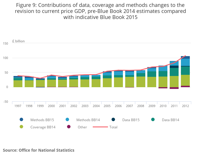 - Other’ includes the removal of the statistical discrepancy in BB14 and changes relating to insurance and narcotics in BB15. ‘Coverage’ includes the BB14 changes relating to illegal activities, research & development, and weapons. ‘Methods’ includes a number of changes in both BB14 and BB15: in BB14 the changes relating to Financial Intermediation Services Indirectly Measured (FISIM) and pensions are the most significant; in BB15 all changes were ‘methods’ changes apart from the incorporation of new data and insurance and narcotics, with the changes relating to exhaustiveness the most significant. ‘Data’ includes Review of NPISH units, GFCF and other changes (assumed to be ESA95) from BB14, and the new data changes in BB15.