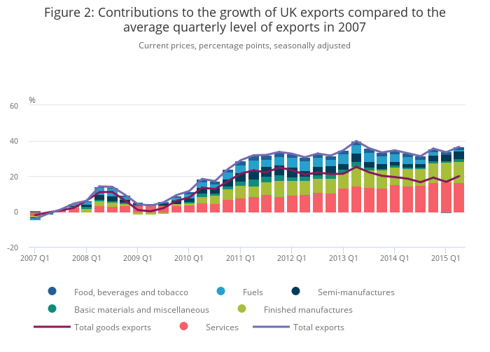 In comparison to output growth since the downturn – which has been concentrated in the services industries – growth in exports has been more evenly split between goods and services. Figure 2 shows contributions to the cumulative growth of nominal exports relative to 2007, and indicates that goods and fuels exports accounted for the majority of export growth between 2007 and 2011 – partly reflecting changes in oil prices. Over the same period services exports grew at a slower pace in value terms. This likely reflects the importance of financial services to the UK’s exports of services, and the slow recovery of this industry over this period. More recently, lower oil prices have played a role in markedly reducing the value of the UK’s exports of fuels and other goods. As a result, goods and services account for fairly even fractions of total nominal exports growth. While the value of UK exports had increased by 36.5% in Q2 2015 compared to 2007, growth in goods exports contributed 19.9 percentage points compared with a slightly more modest 16.6 percentage point contribution from services.