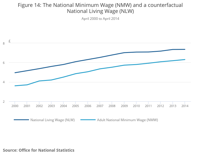 The design of the NLW – in particular its link to the earnings of a reference group – permits an examination of the level it would have taken over the last few years and how it would have evolved in comparison with the adult NMW. This is shown in Figure 14, which compares the adult NMW and a counterfactual NLW – 60% of median earnings for over-25s between 2000 and 2014. In April 2014, the NLW counterfactual was £7.36 while the NMW was £6.31, 86% of the NLW.