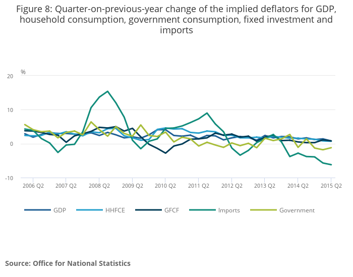 Image .csv .xlsThe four-quarter growth of the GDP deflator has slowed from 2.1% in Q4 2013 to 1.2% in Q4 2014, to just 0.8% in Q2 2015, capturing both the weakness of consumer price inflation (as measured by the household final consumption implied deflator), falling import prices (as captured by the imports implied deflator) and the weakness of implied price growth for government services in recent quarters1. The prices of capital goods – as captured by the Gross Fixed Capital Formation (GFCF) implied deflator – have grown at a broadly similar rate as private consumption in recent years. However, this represents a recovery from the marked divergence between the two series during 2010 and 2011. Following the downturn, both the GFCF implied deflator and the GDP deflator fell markedly compared with the private consumption price inflation. This divergence – which partly reflects the impact of the large depreciation of Sterling in 2008 and 2009 feeding into traded goods and services prices – implies that the weighted price growth of the average UK product fell relative to the rate of consumer price inflation over this period.