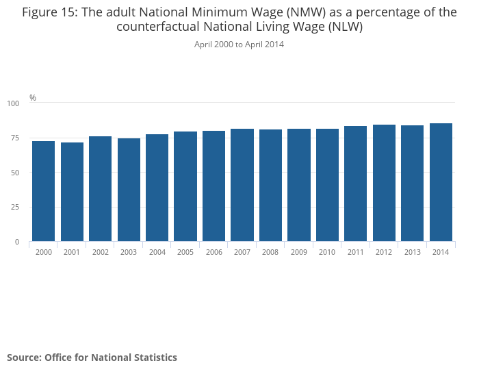 Image .csv .xlsOver this period as a whole, the NMW has generally increased at a rate faster than median earnings, resulting in the percentage difference between the NMW and the NLW counterfactual falling over time. Figure 15 shows that in 2001 the NMW was 72% of the proposed reference level of the NLW - however, by 2014 this gap had closed to 86%.