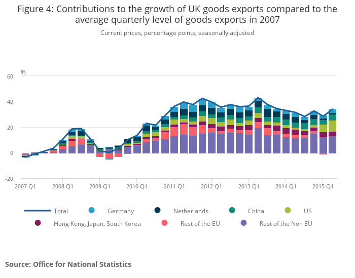 Developments in these trade patterns partly depend on the relative strength of each country’s market in addition to a slowdown in world trade growth relative to GDP growth since the downturn. EU GDP growth was stable at 0.4% in the most recent quarter, while the IMF forecast world output growth to be only slightly slower in 2015 (3.3%) compared to growth in the previous year (3.4%). However, other factors such as the 5.0% appreciation in the Sterling exchange rate between Q2 2014 and Q2 2015 may also be important.