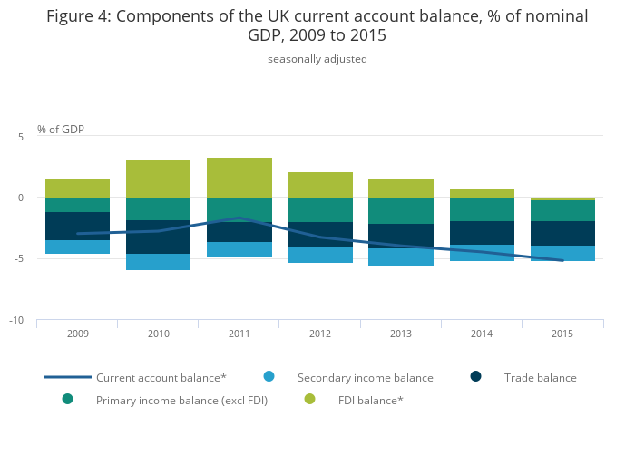 The current account of the balance of payments declined to a record deficit of 5.2% of GDP in 2015, largely as a result of a fall in earnings on UK foreign direct investment (FDI) assets abroad relative to overseas FDI assets in the UK. The exposure of the UK to changes in commodity prices – in particular the oil price – and weaker overseas earnings of some the UK’s largest multinational companies help to explain this recent fall.