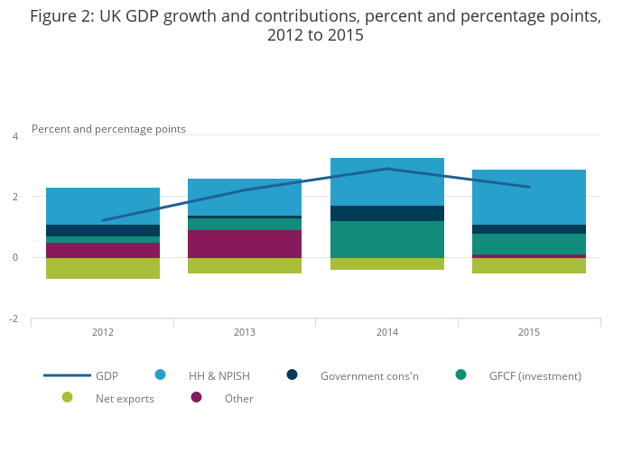 Figure 2: UK GDP growth and contributions, percent and percentage points, 2012 to 2015