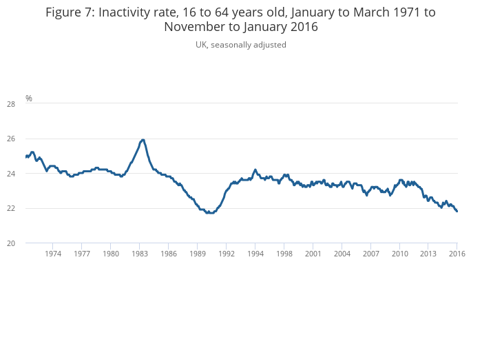 Figure 7: Inactivity rate, 16 to 64 years old, January to March 1971 to November to January 2016
