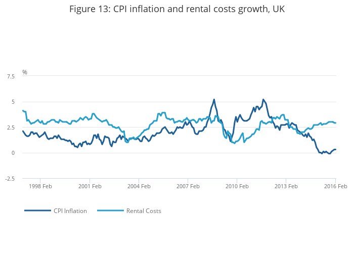 .png (16.0 kB) .xlsx (12.2 kB)While the contributions of several components have been relatively volatile in recent years – in particular, those exposed to changes in the oil price and the value of Sterling – some, largely services products have provided a fairly consistent contribution to the CPI. Figure 13 shows the rate of price change for the aggregate CPI and the rate of rental price change since 1997. While the aggregate CPI has shown relatively large swings in recent years – ranging from more than 5% in 2008 and 2011, to -0.1% in 2015 – the rate of price change for rentals has been more stable. Rental price growth over this period has varied around an average annual rate of 2.7% – falling following the economic slowdowns in the early 2000s and in 2009. As a consequence, rental prices have made a fairly consistent contribution to CPI inflation over this period.
