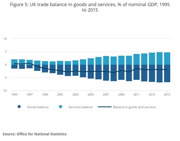 Figure 5: UK trade balance in goods and services, % of nominal GDP, 1995 to 2015
