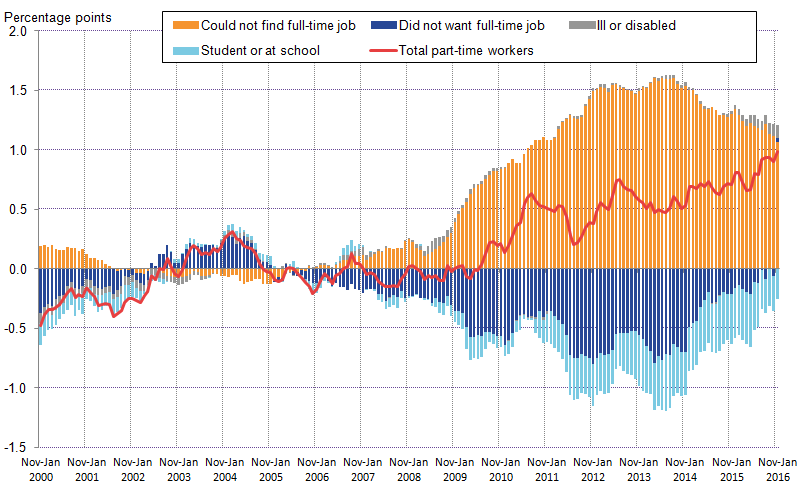 .png (30.7 kB) .xls (30.2 kB)The fall in the inactivity rate is one of several shifts in the labour market since the economic downturn, and comes alongside a rise in the number of people in part-time work. Figure 10 summarises this shift – showing contributions to the 16 and over employment rate of part- and full-time workers1. It indicates that the level of employment fell markedly during the economic downturn, mainly due to a fall in full-time employment. Lower numbers of full-time workers relative to the long-run average reduced the employment rate by 1.9 percentage points at the end of 2009, falling to a drag of 2.7 percentage points in 2012. The trend towards part-time workers appears to have accelerated during the economic downturn, partly offsetting the downward effect from full-time workers. By mid-2012, the employment rate was around 1.7 percentage points below its long-term average, reflecting a large negative contribution from full-time employment (-2.4 percentage points) and a substantial positive contribution from part-time employment (adding 0.8 percentage points to the employment rate). Between mid-2012 and the start of 2016, much of the rise in the 16 and over employment rate relative to its pre-downturn average has been as a result of the recovery of full-time employment, but part-time employment continues to be more prevalent than prior to the downturn.