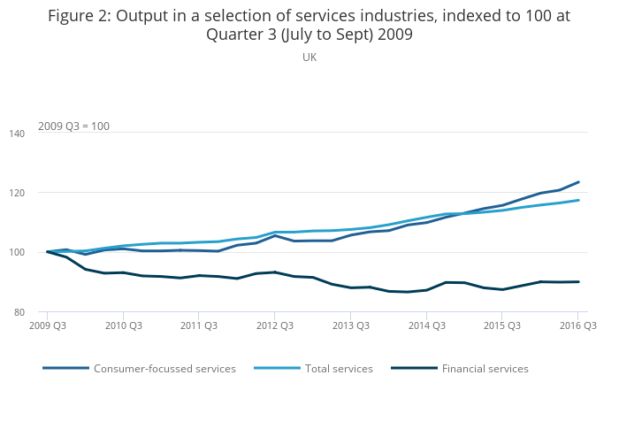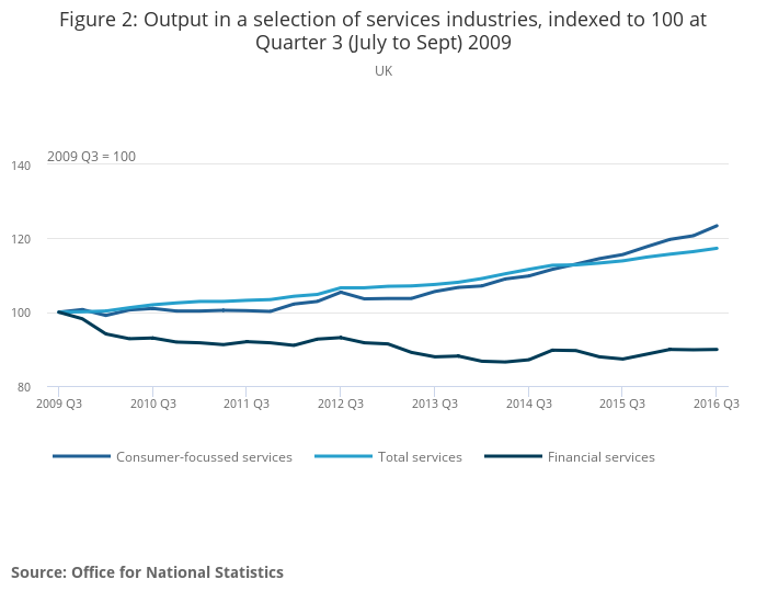 Image .csv .xlsThe consumer-led recovery seen in the most recent quarter can also be seen in the industrial breakdown of output. Figure 2 shows the performance of total services output, a composite industrial indicator based on output in “consumer-focused” industries and output in the financial services industries. It shows that the consumer-focused industries performed broadly in line with total services, from the height of the downturn in Quarter 3 2009 to Quarter 3 2015. In the subsequent year, however, consumer-facing industries grew 6.7% while total services grew 3.0%.