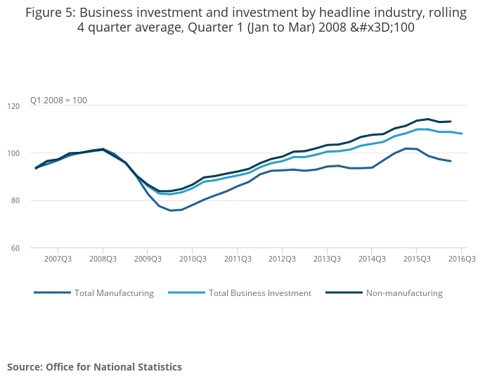 While there has been stronger consumer spending and retail growth, the contribution from investment has showed signs of waning slightly in recent quarters. Business investment grew by 0.9% in Quarter 3 (July to Sept) 2016, this was slightly lower than growth in the previous quarter. However, investment fell 1.6% in the year to Quarter 3 2016, and is down 0.7% on a rolling 4 quarter basis.