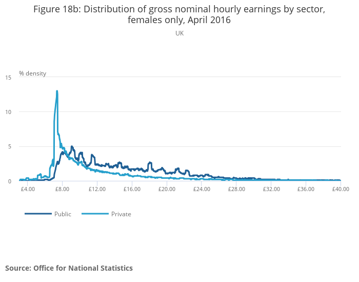 The proportion of part-time workers that have earnings that are within 1% of the National Minimum Wage or National Living Wage is considerably higher than full-time workers. There is a higher share of women in the private sector concentrated around National Living Wage pay rates of £7.20 per hour than women in the public sector. The industries which had the highest share of workers who experienced a pay freeze in 2016 included specialised construction activities and some areas of manufacturing.