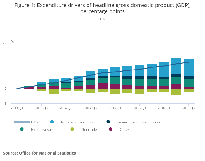Despite some external indictors produced by market analysis companies such as GfK’s indicator of consumer confidence signalling weaker spending intentions, this has not been confirmed by firm economic indicators of spending such as retail sales or household final consumption. As has been the case in recent years, household consumption drove the increase in GDP in Quarter 3 2016, rising by 0.7% on the quarter.