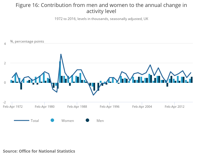 Image .csv .xlsAlthough the number of economically active males has been consistently higher than that for females, the strong growth in female activity since 1971 has closed the gap by more than 66% by early 2016 (February to April).