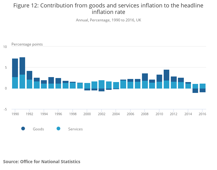 There has been a divergence between services and goods inflation, with services price inflation being relatively stable, around 2.5% since late 2013 - not far below its long-term average of 3.6% between 1994 and 2013.