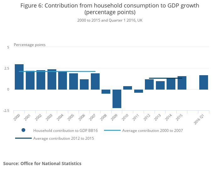 percentage of GDP, 2000 to 2015 and Quarter 1 2015 to Quarter 1 2016, UK