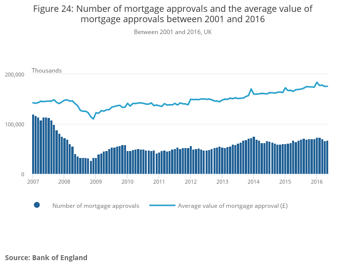 Figure 24: Number of mortgage approvals and the average value of mortgage approvals between 2001 and 2016