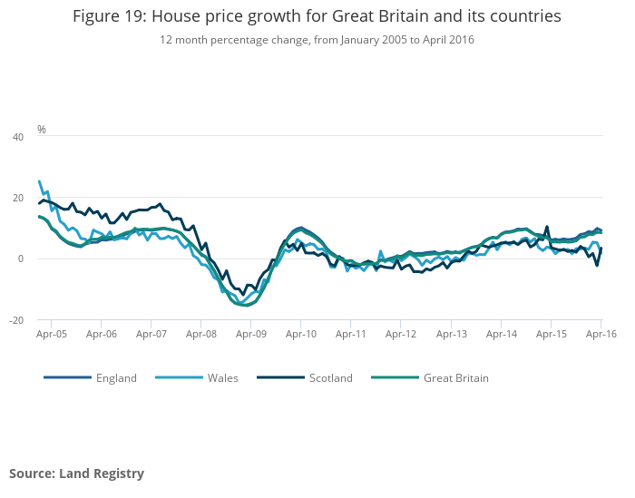 The housing market in England has strongly driven the Great Britain trend and therefore the 2 series are similar over the period shown. The London housing market has a large influence on the England house price data and partly explains the divergence between house prices in England and the equivalent series for Scotland and Wales. House price growth in Scotland was strong before the economic downturn, while during the downturn, the fall in house prices was less pronounced than the rest of Great Britain. However, since the start of 2010, house price inflation in Scotland has remained much weaker than in England overall. This weakened further in late 2015, with the 12-month rate in Scotland increasing 3.3% in April 2016 compared with 9.1% in England. In Wales, house price inflation since the economic downturn has also been weaker than England and stood at 1.7% in April 2016.