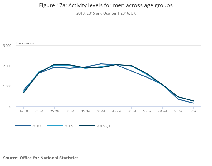 Image .csv .xlsThe increase in the activity level over the age of 50 represents the largest driver of the growth in the activity level for men and women since 2010, and highlights an underlying shift in the labour market towards older workers. This is partly driven by rising retirement ages as well as an inclination to carry on working past retirement. Female participation over the age of 60 has increased by 21.8% since 2010, almost double that for males, and is likely to be heavily influenced by the increase in the state pension age for females in recent years.
