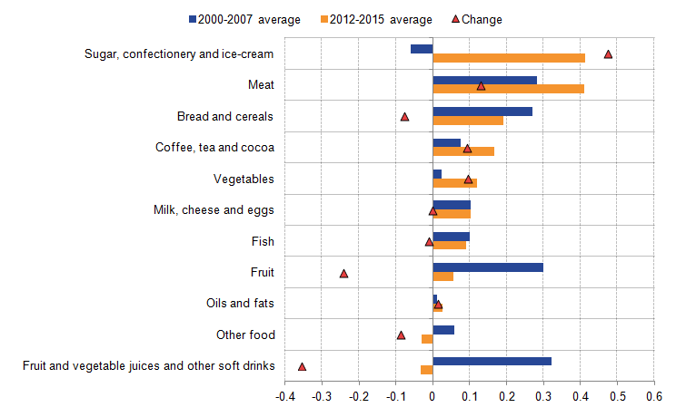 Prior to the downturn, four-fifths of the annual average growth in food and non-alcoholic beverage consumption was explained by 4 of the 11 categories (in percentage points) - fruit and vegetable juices and other soft drinks ; fruit ; meat and bread and cereal. Meanwhile between 2012 and 2015 roughly the same proportion of food and beverage consumption was accounted for by 4 categories, with 2 remaining the same (in percentage points) – meat and bread and cereal . Consumption of fruit and vegetable juices and other soft drinks, bread and cereals and fruit went down, while consumption of sugar, confectionary and ice cream, meat, coffee, tea and cocoa and vegetables increased. Within the broad shifts in household consumption of food and non-alcoholic beverages, pre and post-downturn, 1 of the largest contributions to household consumption between 2012 and 2015 has been from consumption of sugar-related products.