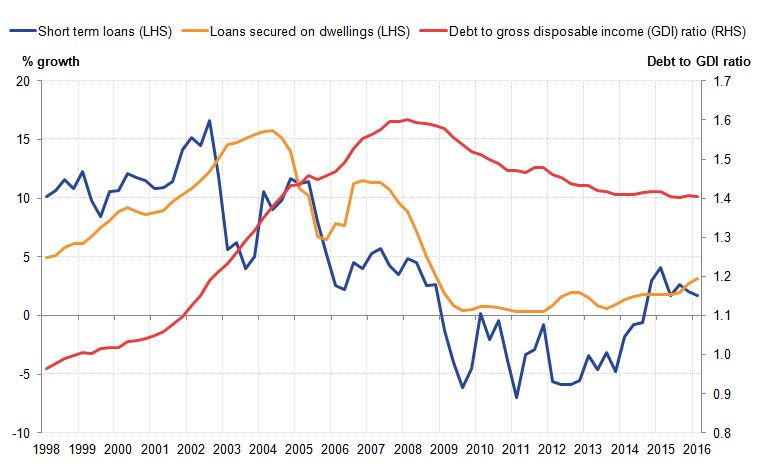 In recent quarters, households have started to increase their borrowing once again. From Q4 2013 to Q1 2016 short-term loan debt has increased by 6.0%, while debt secured on dwellings has increased by 5.3%. Focussing on the latest quarter, debt secured on dwellings has grown by 3.1% compared with 2015 Q1; the fastest rate since Q4 2008.