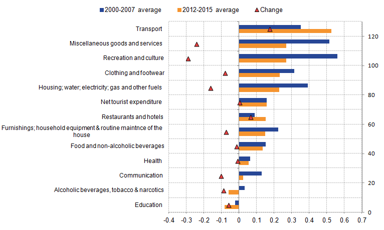 Image .csv .xlsFigure 7 shows contributions to the annual growth of household consumption from its 13 components for the period prior to the economic downturn (2000 to 2007) and the period since the recovery became established (2012 to 2015). It shows that 5 of the 13 categories clothing and footwear (0.2 percentage points); housing, water, electricity, gas and other fuels (0.2); transport (0.5); recreation and culture (0.3); miscellaneous goods and services (0.3) make up the majority of growth in household consumption. In the period 2012 to 2015 these categories made up 74% of household consumption growth.