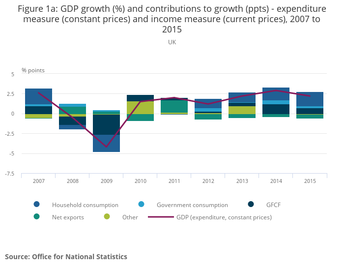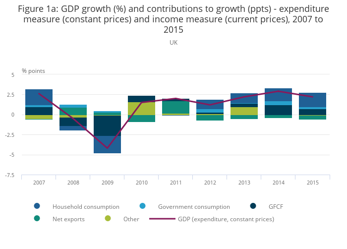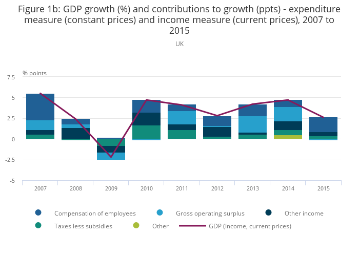 Download this chart Figure 1a: GDP growth (%) and contributions to growth (ppts) - expenditure measure (constant prices) and income measure (current prices), 2007 to 2015