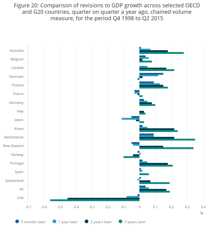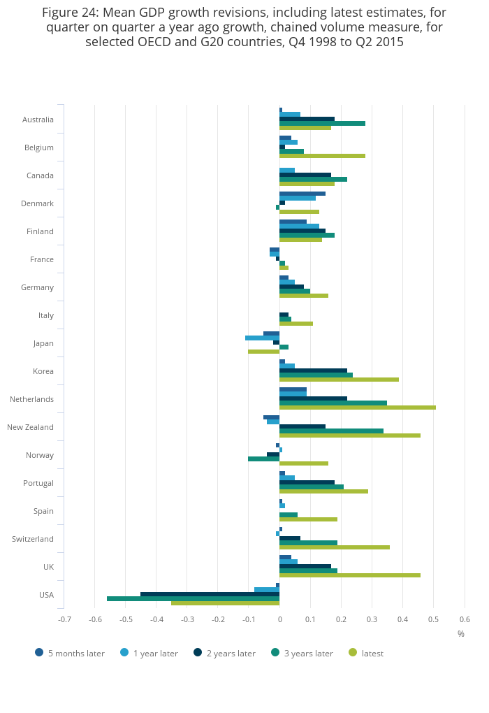Figure 25: Mean GDP growth revisions, including latest estimates but removing the impact of the switch to CPI for the UK, for quarter on quarter growth, chained volume measure, for selected OECD and G20 countries, Q4 1998 to Q2 2015