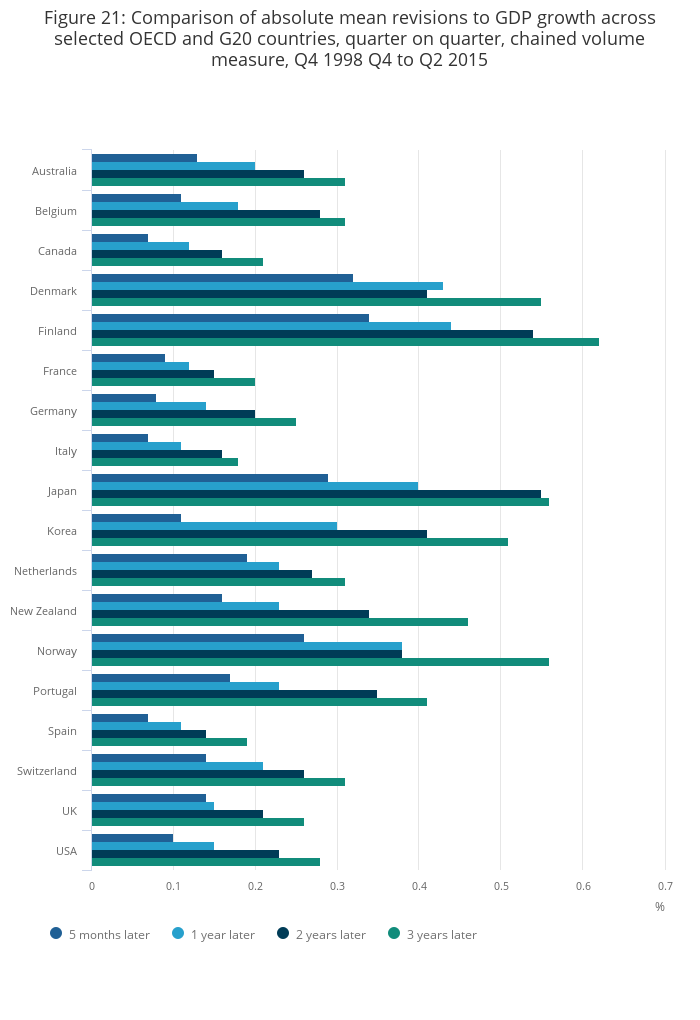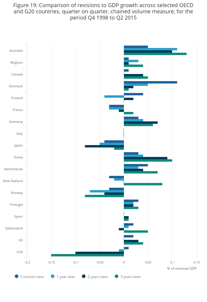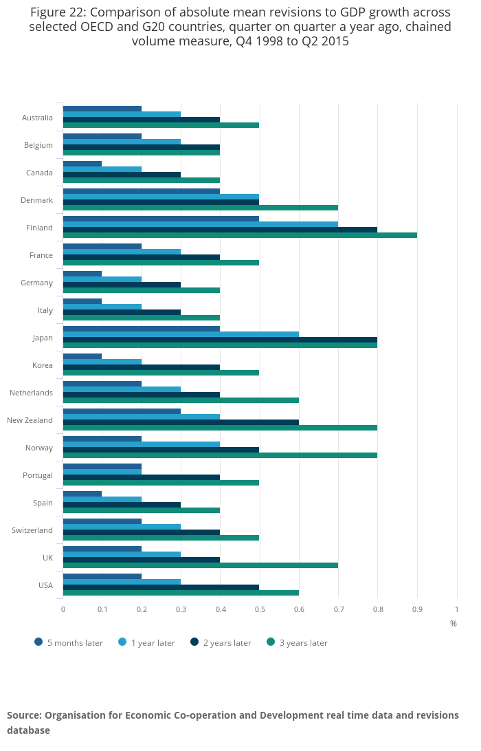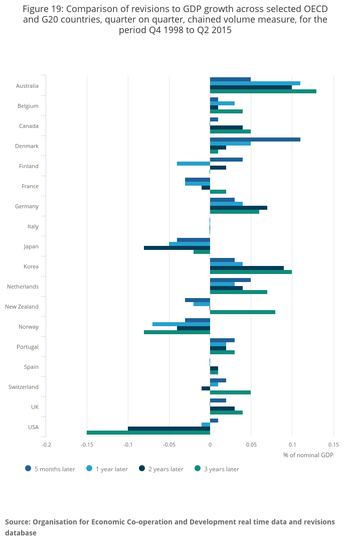 Extensive analysis of OECD data over a 17 year period shows that average revisions to UK GDP growth estimates for periods up to 3 years after initial publication are among the smallest across 18 OECD and G20 economies, and show no systematic bias.