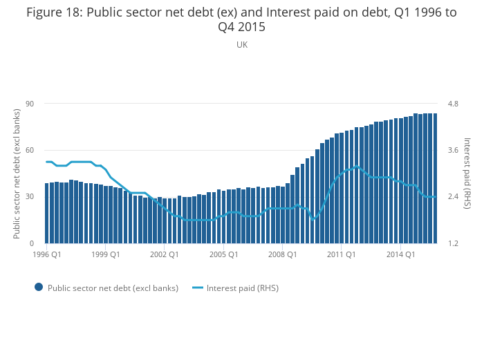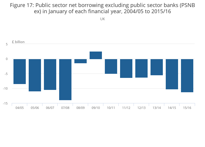 The continuation of the economic recovery and strength of employment growth have both contributed to reductions in Public Sector Net Borrowing. Figure 16 shows the performance of cumulative Public Sector Net Borrowing excluding public sector banks (PSNB ex) for the latest financial year-to-date (April 2015 to January 2016), and the previous 3 financial years. It shows that there was a marked reduction of around £18 billion between 2012/2013 and 2013/2014. However, the reduction between 2013/14 and 2014/15 (£11.1 billion) was smaller, particularly in the first half of that financial year. The reduction in the latest financial year to date (April 2015 to January 2016), accumulates to a fall in borrowing of £10.6 billion, to £66.5 billion, in the first 10 months of the financial year.
