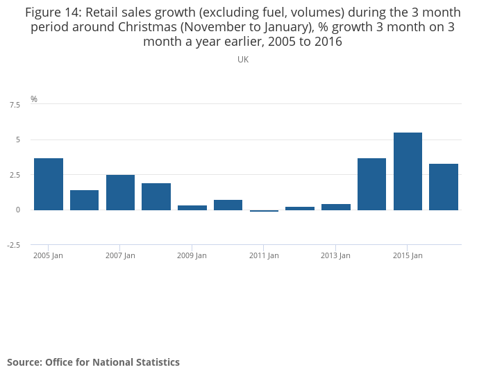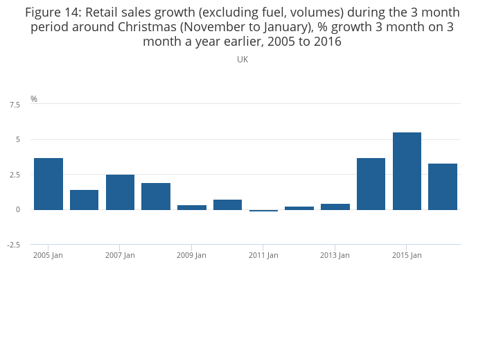 Figure 14: Retail sales growth (excluding fuel, volumes) during the 3 month period around Christmas (November to January), % growth 3 month on 3 month a year earlier, 2005 to 2016
