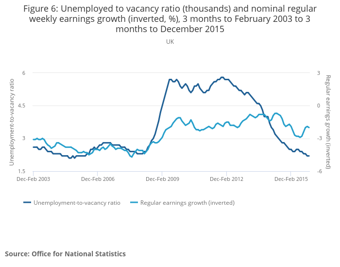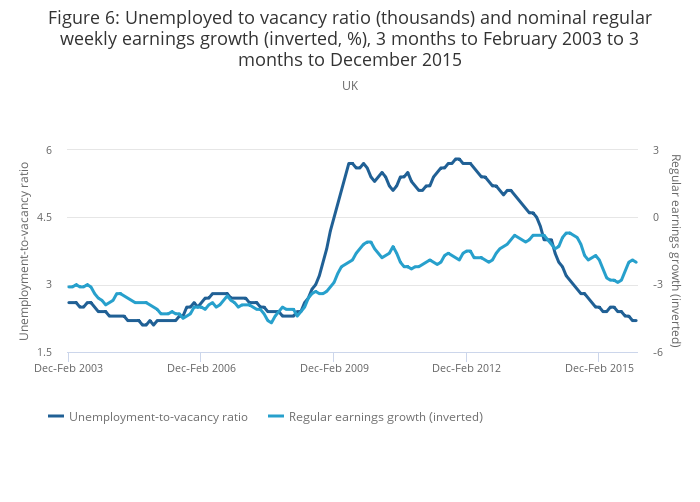Figure 6: Unemployed to vacancy ratio (thousands) and nominal regular weekly earnings growth (inverted, %), 3 months to February 2003 to 3 months to December 2015