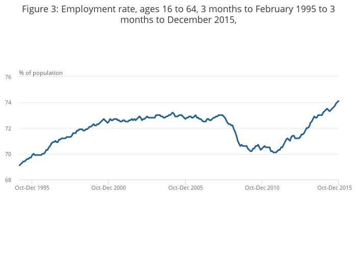 Figure 3: Employment rate, ages 16 to 64, 3 months to February 1995 to 3 months to December 2015,