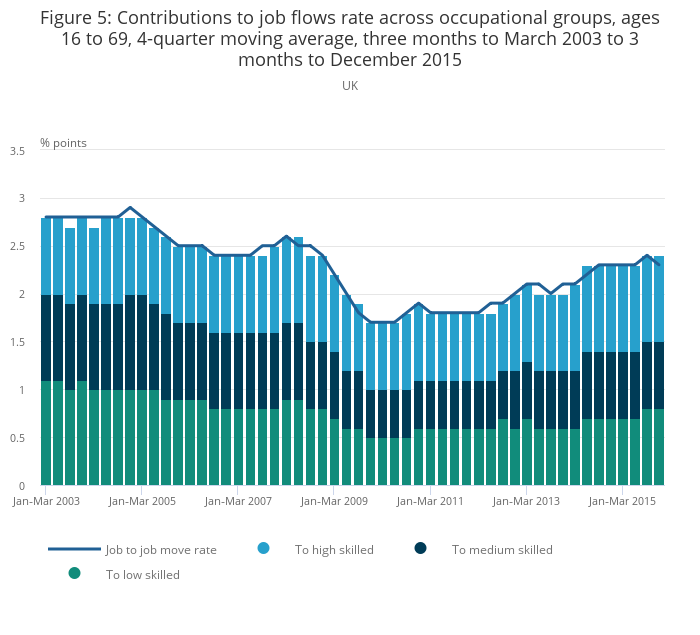 Image .csv .xlsMuch of the growth in job-to-job flows has been driven by the continued recovery in job mobility among low skilled posts. Figure 5 breaks the job-to-job move rate into the contributions from moves into 3 forms of occupation broadly categorised into high, medium and low skilled. It shows that falling contributions from the low and medium skilled categories account for much of the fall in mobility during the economic downturn: these groups accounted for 0.6 percentage points of the 0.7 percentage points fall in the move rate between 2007 and 2009. Mobility in the high-skilled group fell to a more limited extent, but recovered relatively quickly. The most recent uptick in mobility appears to have largely been driven by higher job-to-job moves among low-skilled employees, accounting for more than half the increase in the move rate over the past 2 years.
